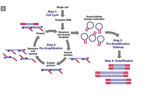 PicoPLEX Gold的技術概要。通過step1裂解細胞獲得gDNA,通過隨機引物進行預擴增 (step 2),然后進行指數(shù)擴增得到測序文庫(step 4)。