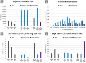 Panel D. PicoPLEX Gold試劑盒中的聚合酶具有高保真度(藍色),使得等位基因插入率與A產品(灰色)相當,且顯著低于PicoPLEX WGA(紫色)。