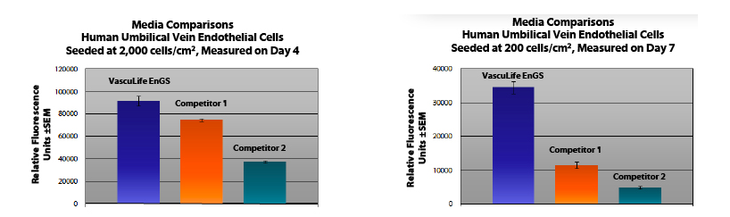 VascuLife?Engs培養(yǎng)基生長HUVEC和其他人大血管內(nèi)皮細(xì)胞,不添加人VEGF,在保持良好細(xì)胞形態(tài)的同時滿足或超過其他商業(yè)上可用的含血清培養(yǎng)基。與其他商業(yè)媒體相比較,VascuLife?在不同的播種密度下表現(xiàn)出較好的增殖能力。