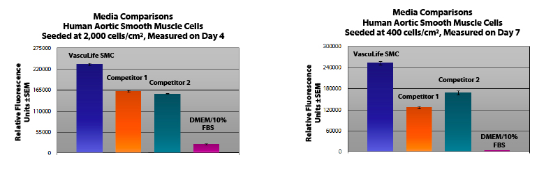 VascuLife?SMC培養(yǎng)基通過至少15個(gè)群體倍體培養(yǎng)人平滑肌細(xì)胞,達(dá)到或超過其他商用含血清培養(yǎng)基,同時(shí)保持良好的細(xì)胞形態(tài)。與其他商業(yè)媒體相比較,VascuLife?在不同的播種密度下表現(xiàn)出較好的增殖能力。