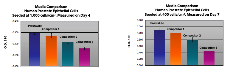 ProstaLife?培養(yǎng)基通過至少15次人口倍增培養(yǎng)人類生殖上皮細(xì)胞,在保持良好細(xì)胞形態(tài)的同時(shí)滿足或超過其他商業(yè)培養(yǎng)基。與其他商業(yè)化培養(yǎng)基相比,ProstaLife?在不同的接種密度下表現(xiàn)出更好的增殖能力。