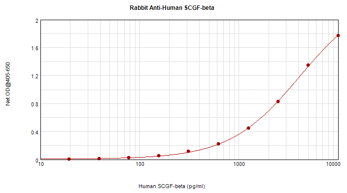 為了通過Sandwich ELISA(使用100μl/孔抗體溶液)檢測人SCGF-β,需要濃度為0.5-2.0μg/ ml的該抗體。這種抗原親和純化的抗體與PeproTech的生物素化抗人類SCGF-β(500-P99GBt)結(jié)合作為檢測抗體,可以檢測到至少0.2-0.4 ng /孔的重組人SCGF-β。