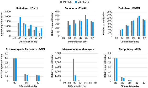這些圖表追蹤了通過RT-qPCR測量的從hiPS細(xì)胞(從第0天開始)到DE細(xì)胞(到第7天)分化過程中各種標(biāo)記物的相對時(shí)間mRNA表達(dá)水平。